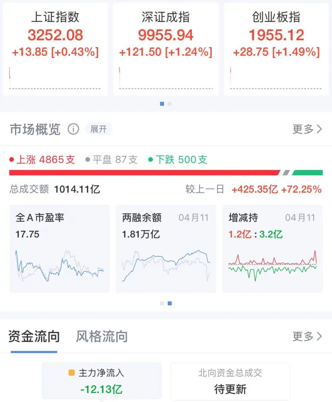 4月14日开盘,A股全线飘红,截至发稿沪指涨0.43%,深成指涨1.24%,创业板指涨1.49%。全市超4800股上涨,消费电子、苹果产业链、CPO等板块集体爆发,朝阳科技等涨停。