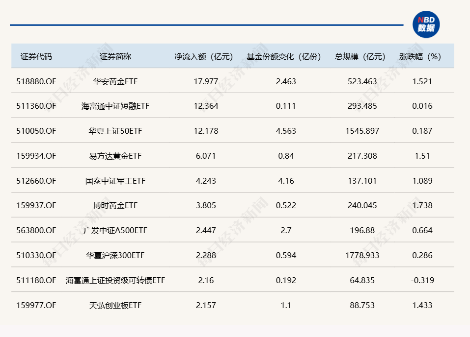 Wind数据显示,在4月11日的非货币ETF市场中,华安黄金ETF基金份额增加2.46亿份,净流入额为17.98亿元;海富通中证短融ETF份额增加0.11亿份,净流入额为12.36亿元;华夏上证50ETF份额增加4.56亿份,净流入额为12.18亿元。