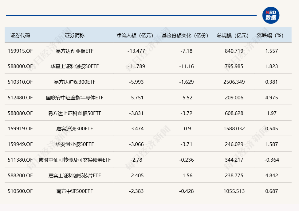 与此同时,易方达创业板ETF基金份额减少7.18亿份,净流出额为13.48亿元;华夏上证科创板50ETF份额减少11.16亿份,净流出额为11.79亿元;易方达沪深300ETF份额减少1.63亿份,净流出额为5.99亿元。