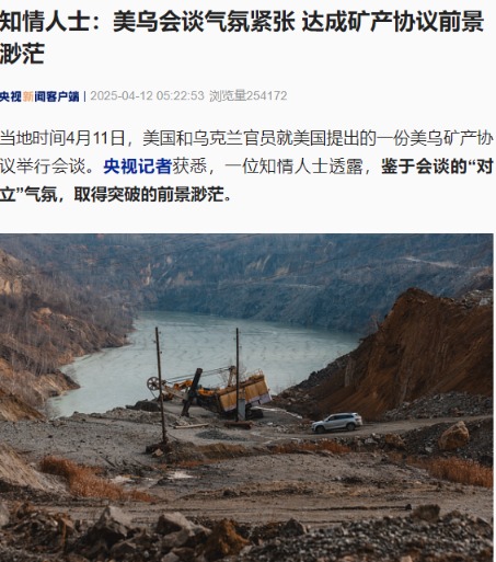 据央视新闻4月12日消息,当地时间4月11日,美国和乌克兰官员就美国提出的一份美乌矿产协议举行会谈。央视记者获悉,一位知情人士透露,鉴于会谈的“对立”气氛,取得突破的前景渺茫。