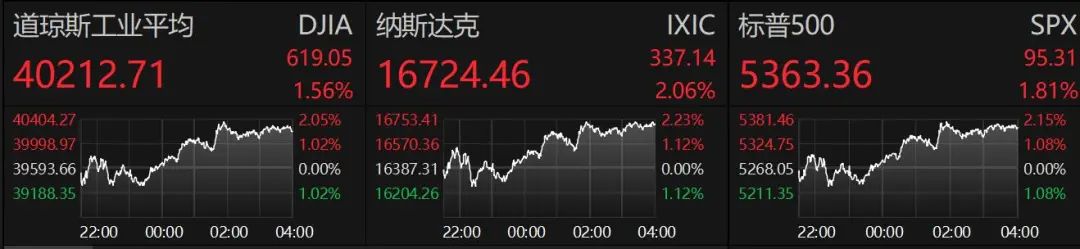周五美股三大指数低开,随后集体拉升收涨,截至收盘,纳斯达克指数涨2.06%,标普500指数涨1.81%,道琼斯指数涨1.56%。
