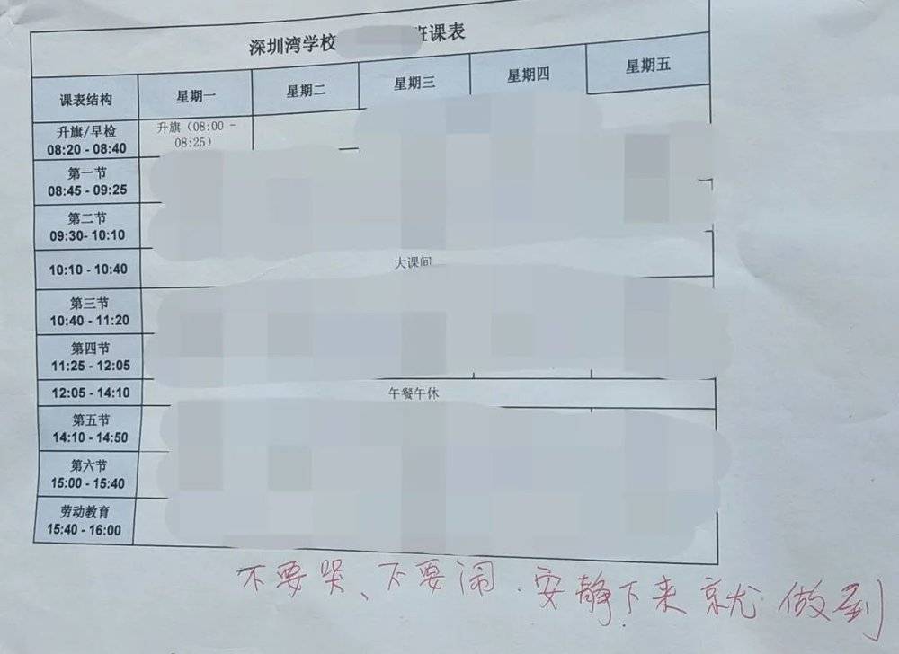 因为写不出字、写错字,宁宁在做作业的过程中经常焦躁不安,情绪波动很大,妈妈就抓着他的手用红色圆珠笔在课程表上写下:不要哭,不要闹,安静下来就做到。
