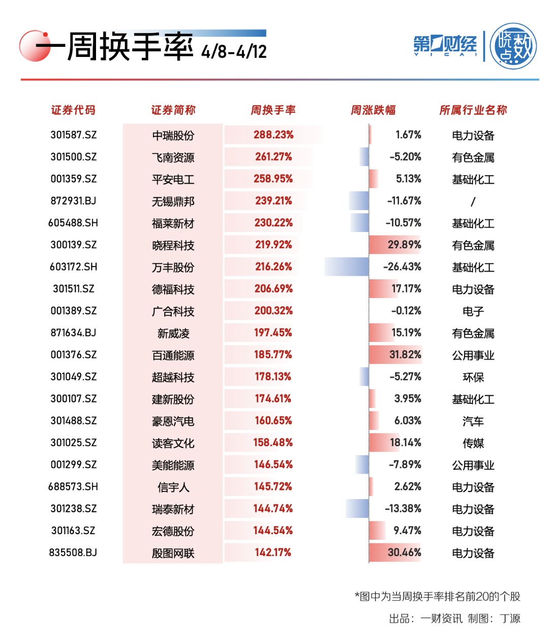 本周共有61只个股换手率超过100%。其中,中瑞股份排名居首,周换手率达到288.23%;此外,飞南资源、平安电工、无锡鼎邦、福莱新材等8股换手率也超200%。