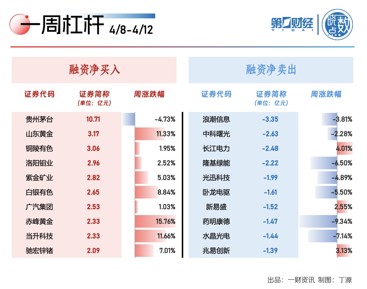 贵州茅台本周获融资净买入居首,净买入额为10.71亿元。山东黄金、铜陵有色、洛阳钼业获净买入居前,金额分别为3.17亿元、3.06亿元、2.96亿元;浪潮信息、中科曙光、长江电力遭净卖出额居前,金额分别为3.35亿元、2.63亿元、2.48亿元。