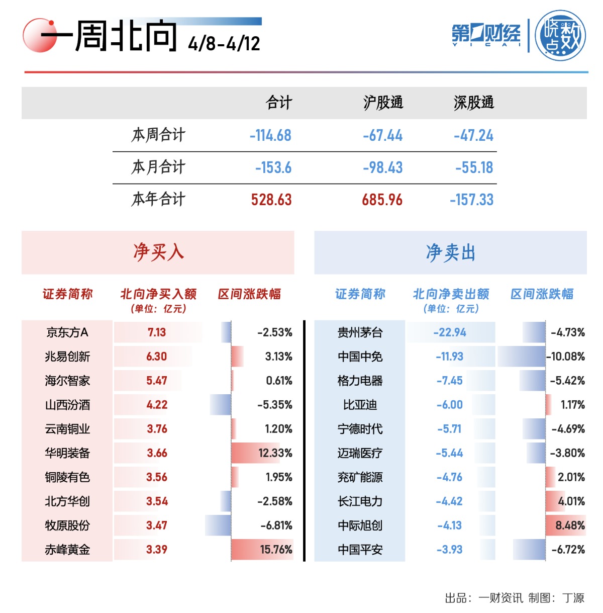 据统计,北向资金本周累计净流出114.68亿元,其中,沪股通合计净流出67.44亿元,深股通合计净流出47.24亿元。截至4月12日,北向本月合计净流出153.6亿元,本年合计净流入528.63亿元。