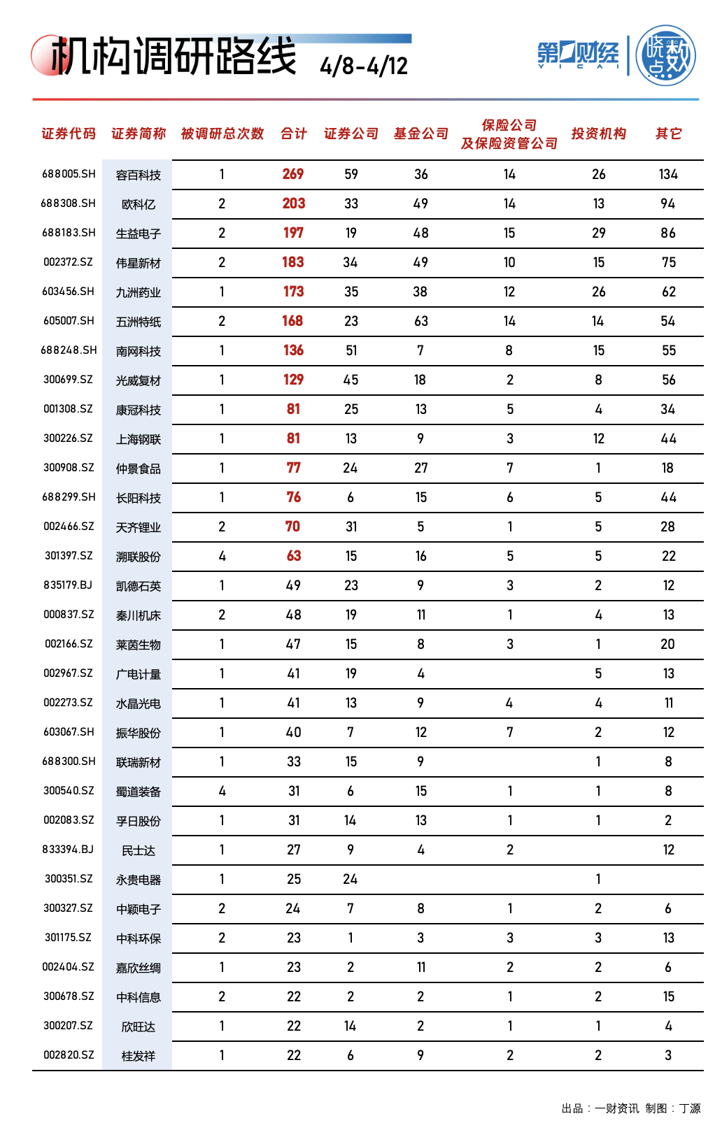 机构本周共调研了228家上市公司,其中容百科技最获关注,参与调研的机构达269家。此外,欧科亿获203家机构调研,生益电子获197家机构调研。
