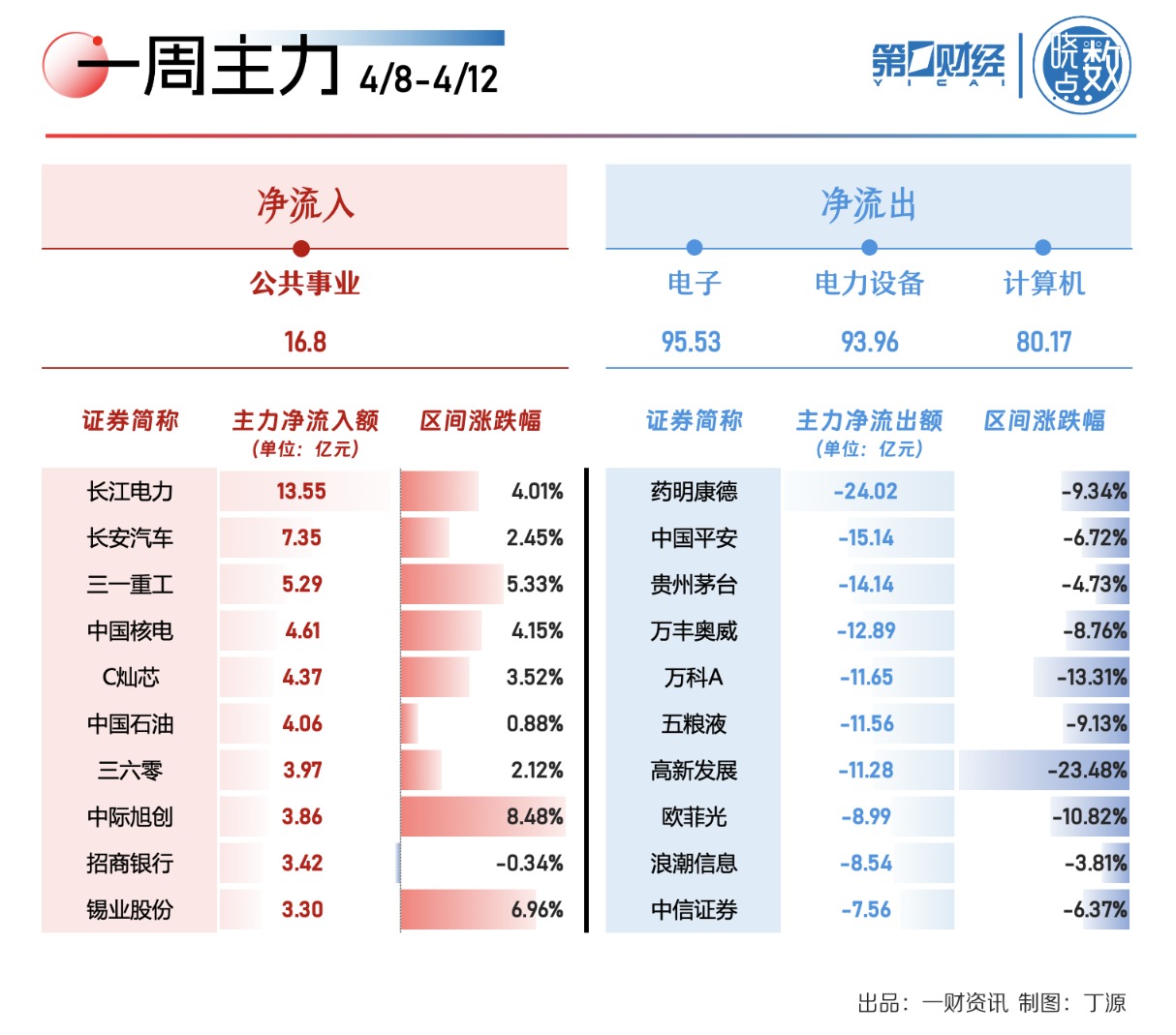个股方面,本周长江电力、长安汽车、三一重工、中国核电、C灿芯获主力净流入居前,分别为13.55亿元、7.35亿元、5.29亿元、4.61亿元、4.37亿元;净流出方面,药明康德、中国平安、贵州茅台、万丰奥威、万科A净流出额居前,药明康德遭抛售超24亿元。