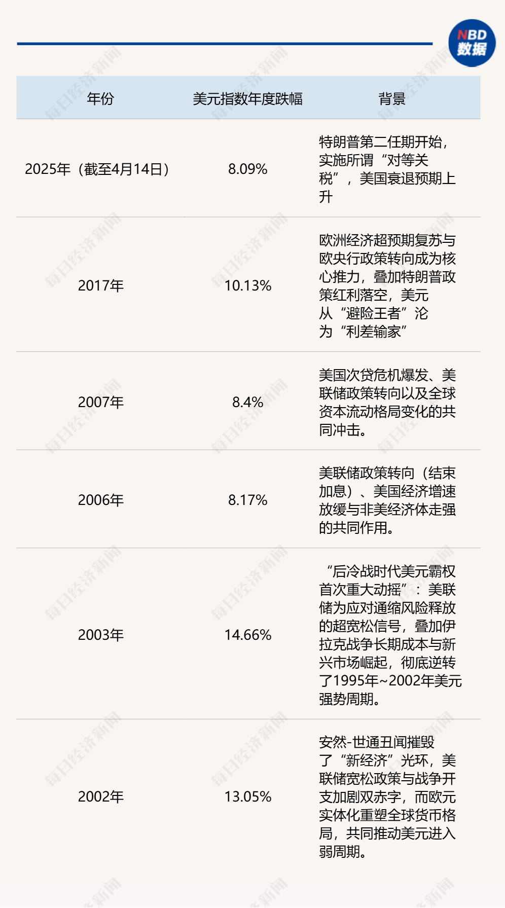 年初至4月14日收盘,美元指数已累计跌8.09%,目前跌势仍在延续。而美元上一次在一年内累计下挫超过8%还是在2017年,当时欧洲经济超预期复苏与欧央行政策转向成为核心推力,叠加“特朗普1.0”政策红利落空,美元从“避险王者”沦为“利差输家”,年内累计跌幅超过10%。回顾本世纪以来的美元走势,2017年之外,只有2007年、2006年、2003年和2002年的跌幅比今年的跌幅大。