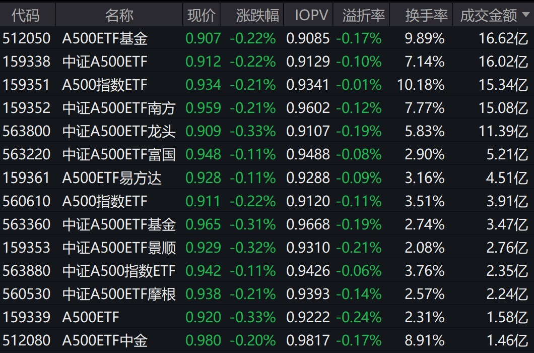 截至上午收盘,场内32只跟踪中证A500指数的ETF小幅下跌,其中有14只中证A500相关ETF成交额超1亿元,5只超10亿元,A500ETF基金、中证A500ETF、A500指数ETF早盘成交额分别为16.62亿元、16.02亿元、15.34亿元。