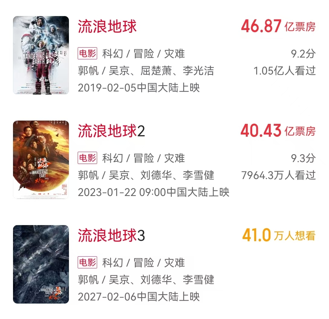 2025年4月15日,电影《流浪地球3》官方微博宣布开机,距离上映还有662天。导演郭帆携主演吴京、沈腾等出席开机仪式。吴京表示希望自己能多演喜剧,沈腾则期待多点动作戏,两人互换角色引发期待。该系列前两部作品均取得票房口碑双丰收,《流浪地球》2019年上映票房达46.87亿元,《流浪地球2》2023年上映票房达40.43亿元。