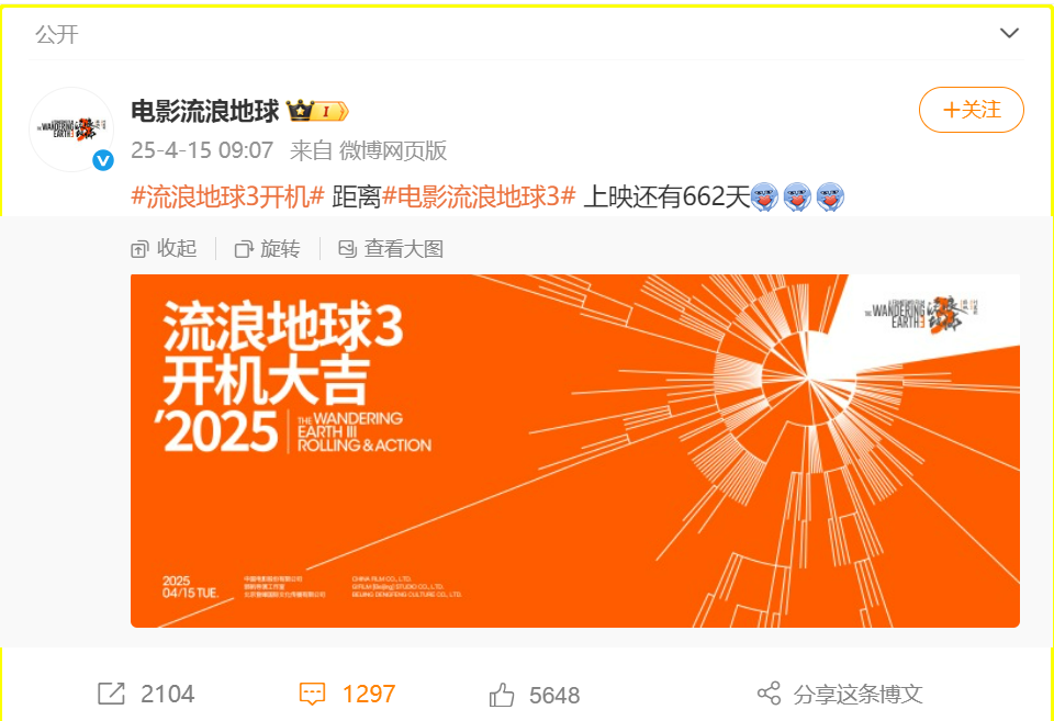 4月15日,电影流浪地球官方微博宣布《流浪地球3》开机,并表示距离上映还有662天。
