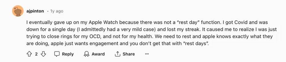 然而,对很多坚持健身打卡的人来说,“请假”功能却是一项非常实用的功能,因为对不少人而言,完成健康目标已经日渐变成了一种“心理压力”。Reddit上有网友表示: