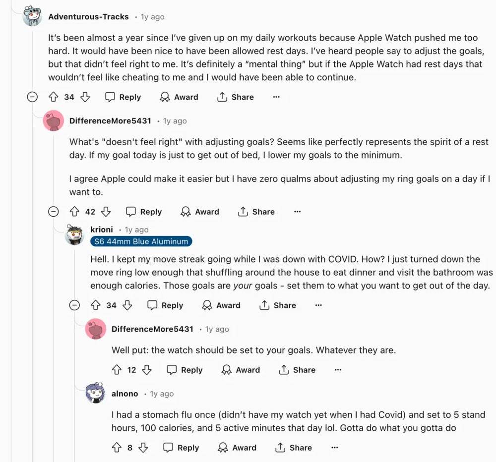 这很快成为好评度最高的Apple Watch新功能之一,而在这之前,国外论坛Reddit上几乎每几个月都会有要求苹果为Apple Watch加入训练圆环暂停功能的帖子,每个帖子都会有成百上千的用户参与讨论。