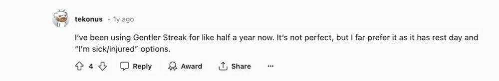 有用户表示,自己喜欢Gentler Streak的原因就在于它有休息日和“生病/受伤”选项。