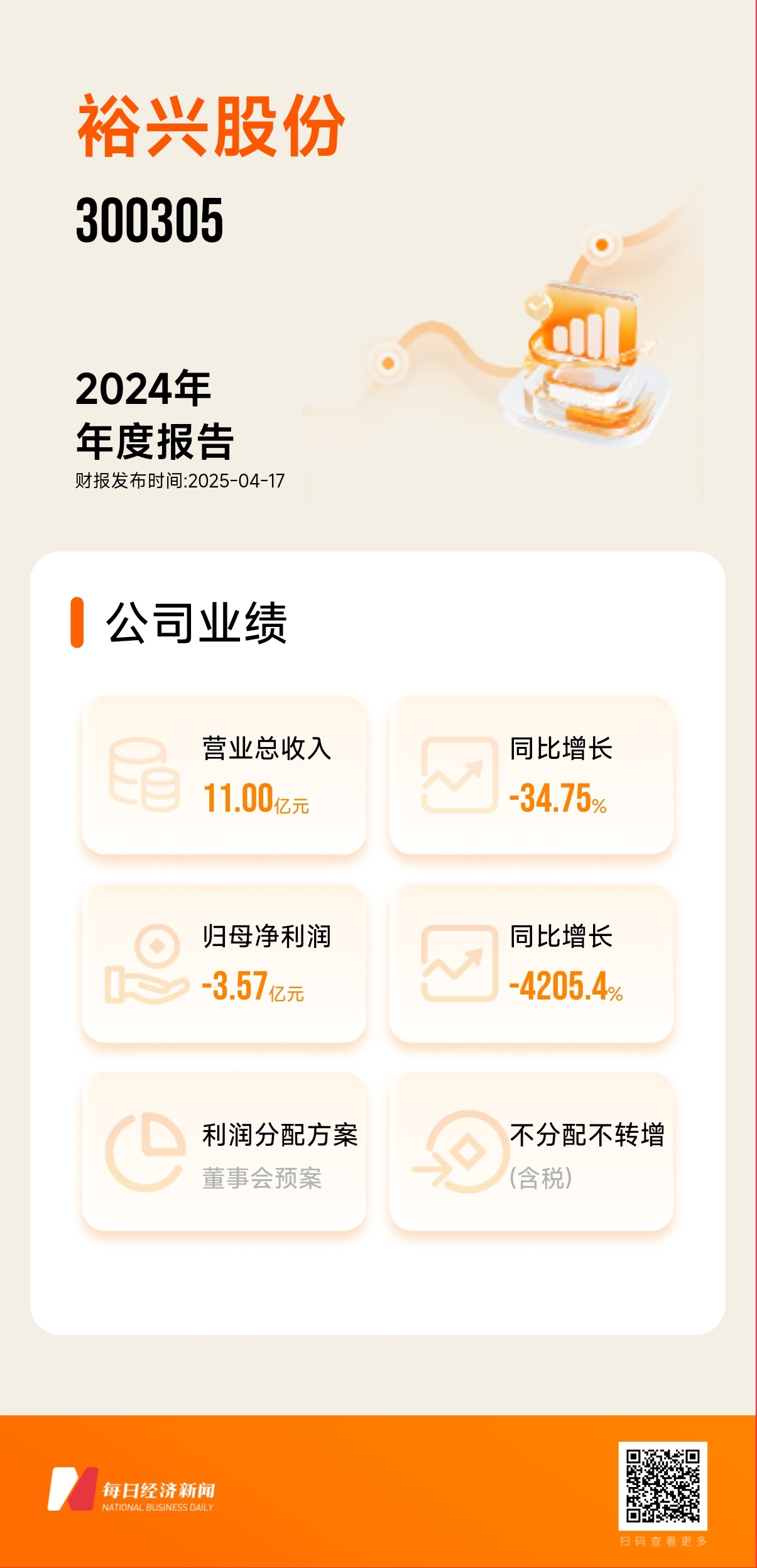 4月16日晚间,裕兴股份发布2024年财报,报告期内,公司实现营业收入11.00亿元,同比下降34.75%;对应的归母净利润亏损3.57亿元,同比下降4205.40%。
