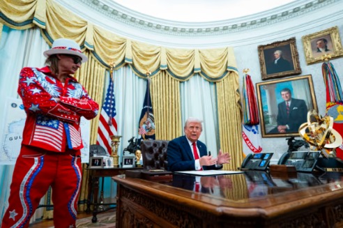 或许,对“土豪金”的喜爱也在一定程度上映衬着特朗普好大喜功的性格。这种对黄金、财富、权力的狂热崇拜,如今已从特朗普的私人领域蔓延至美国政治权力的心脏。或许正如特朗普试图打造的反射金光的总统肖像所暗示的,在这个充满表演的政治时代,权力美学本身已成为一种统治工具。