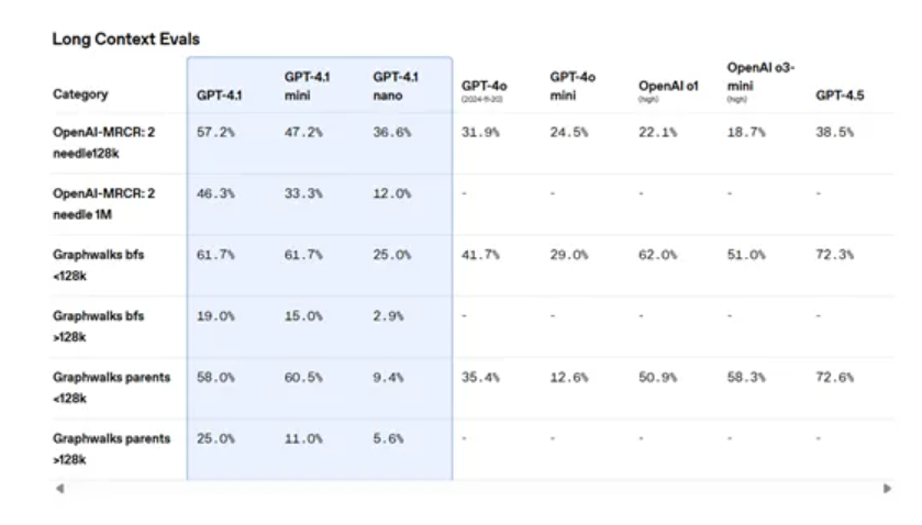 与前代模型相比,GPT-4.1、GPT-4.1 Mini和GPT-4.1 Nano能够处理多达100万tokens的上下文,是GPT-4o的8倍。