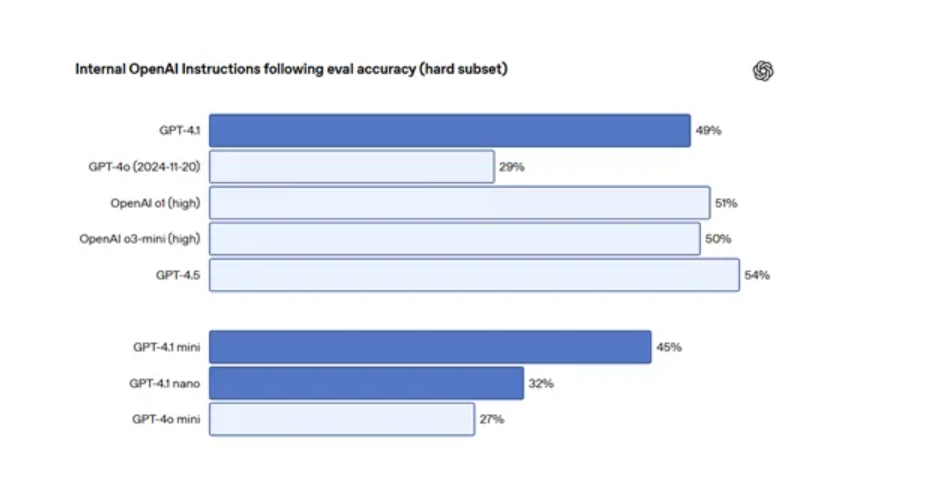 在指令遵循能力测试中,OpenAI构建内部评估体系,模拟API开发者使用场景,测试模型对复杂指令的遵循能力。每个样本包含分属不同类别的复杂指令,并分难度等级。在困难子集评估中,GPT-4.1远超GPT-4o。