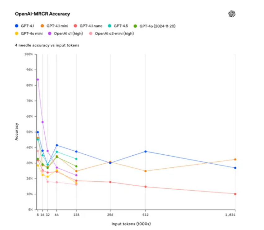 测试结果显示,GPT-4.1在处理长达128K tokens的数据时显著优于GPT-4o,并且在长达100万tokens的上下文中依然能够保持较高的性能。