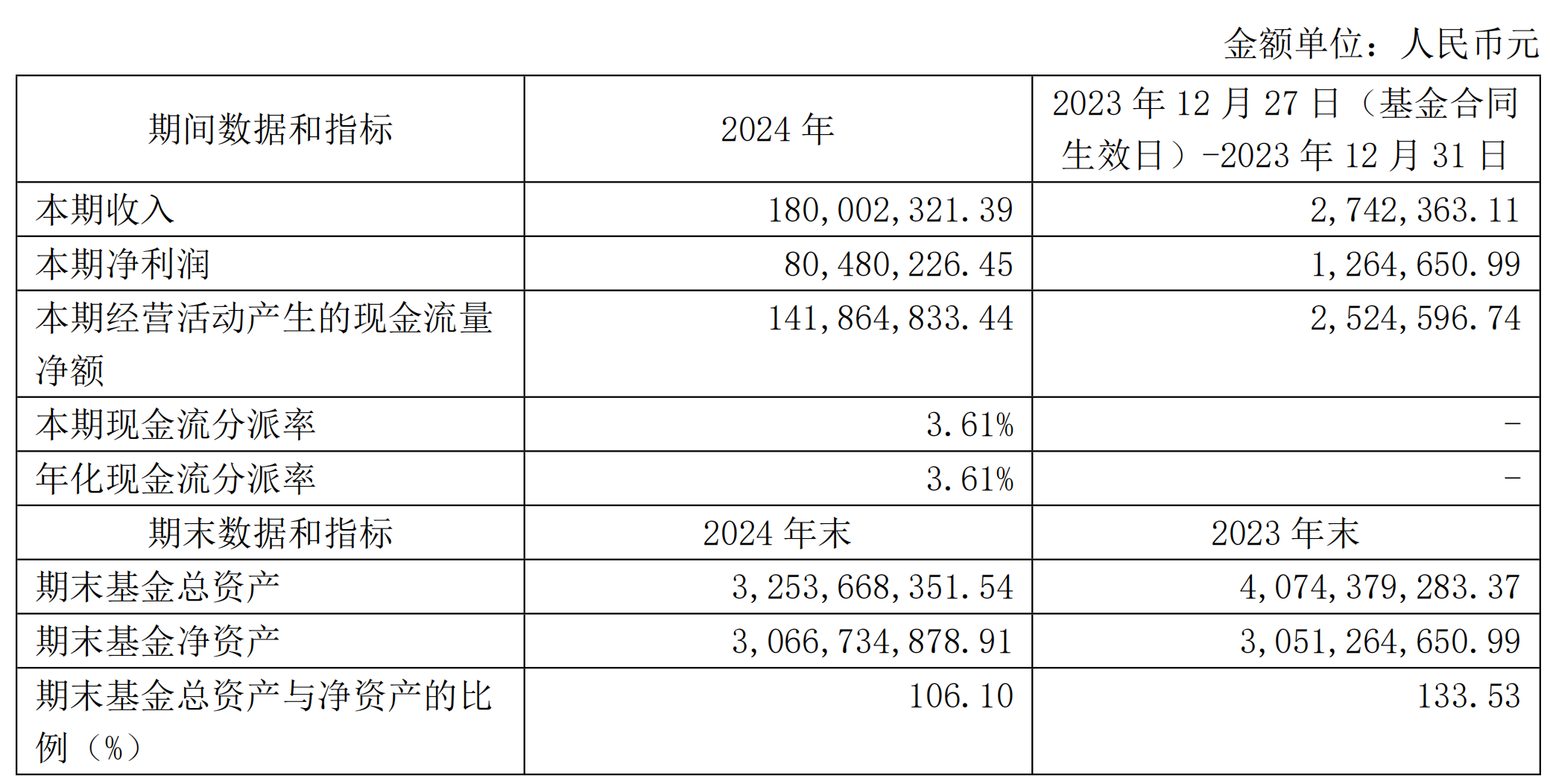 在报告期内,国泰君安城投宽庭保租房REIT实现营业收入约为1.80亿元,净利润约为8048.02万元,经营活动产生的现金流量净额约为1.42亿元;当期可供分配的金额约为1.31亿元,超过了招募说明书中的预测值,单位可供分配金额为0.1307元;基金的总资产和净资产分别达到32.53亿元和30.67亿元。