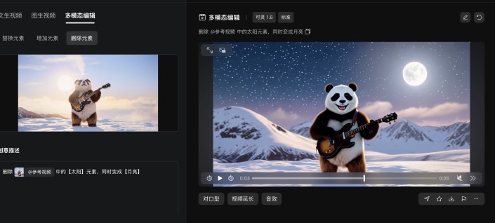 不过,记者注意到,在替换相关元素后,也存在部分原细节丢失的情况。如,“熊猫弹吉他”视频中,太阳被替换为月亮后,原描述中的“戴墨镜”、“吐气”等要求并未表现(如下图)。