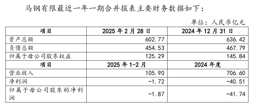 马钢有限目前的经营范围包括钢铁冶炼、炼焦、钢压延加工、化工产品生产及销售(不含许可类化工产品)、热力生产和供应、铁合金冶炼等。2024年,公司的营业收入为706.6亿元、净利润为-40.51亿元、归母净利润为-41.74亿元;2025年1—2月,公司的营业收入为105.9亿元、净利润为-1.72亿元、归母净利润为-1.87亿元。