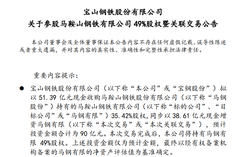 4月17日晚间,宝钢股份(600019)公告,拟以51.39亿元现金收购马钢股份持有的马鞍山钢铁有限公司(简称“马钢有限”或“标的公司”)35.42%股权,同步以38.61亿元现金增资标的公司,预计投资金额合计为90亿元。