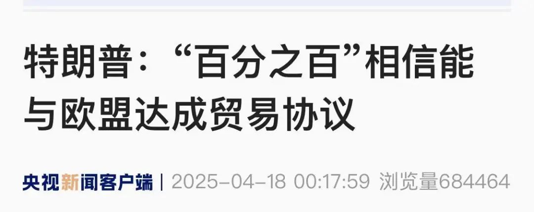 特朗普当天表示,“百分之百”有信心在90天的关税暂停期结束前与欧盟达成贸易协议。