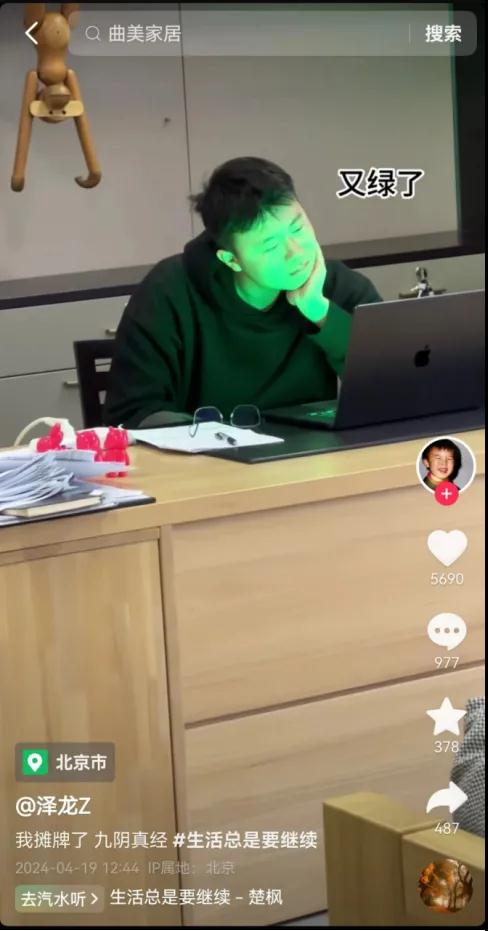 赵泽龙不仅非常具有网感,还能巧妙地借梗造势。比如,有网友调侃曲美家居股票阴跌,他立刻以此为灵感发布了一条以“九阴真经”为标题视频,赵泽龙被电脑屏幕照映得脸泛绿光,引发了网友们的热烈讨论。