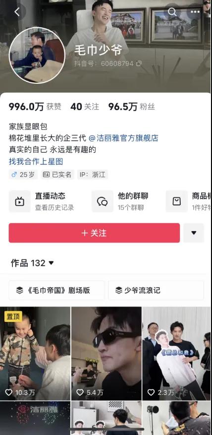 有趣的是,除了赵泽龙之外,还有不少富二代和企三代聚集在短视频直播赛道。例如,洁丽雅集团董事长石磊的儿子石展承,他使用“毛巾少爷”的账号为消费者演绎豪门短剧,目前已经有上亿播放量。