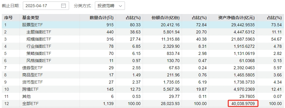 4月18日,资本市场迎来新里程碑:全市场ETF(交易型开放式指数基金)总规模,首次突破4万亿元大关。