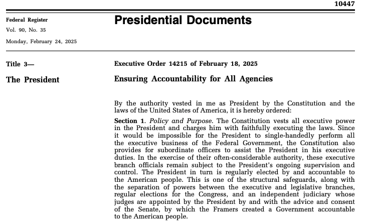 这份备忘录旨在落实特朗普今年2月签署的14215号行政令。按照特朗普对美国宪法的个人解释,他认为自己有权力监督并控制整个行政分支的所有机构。