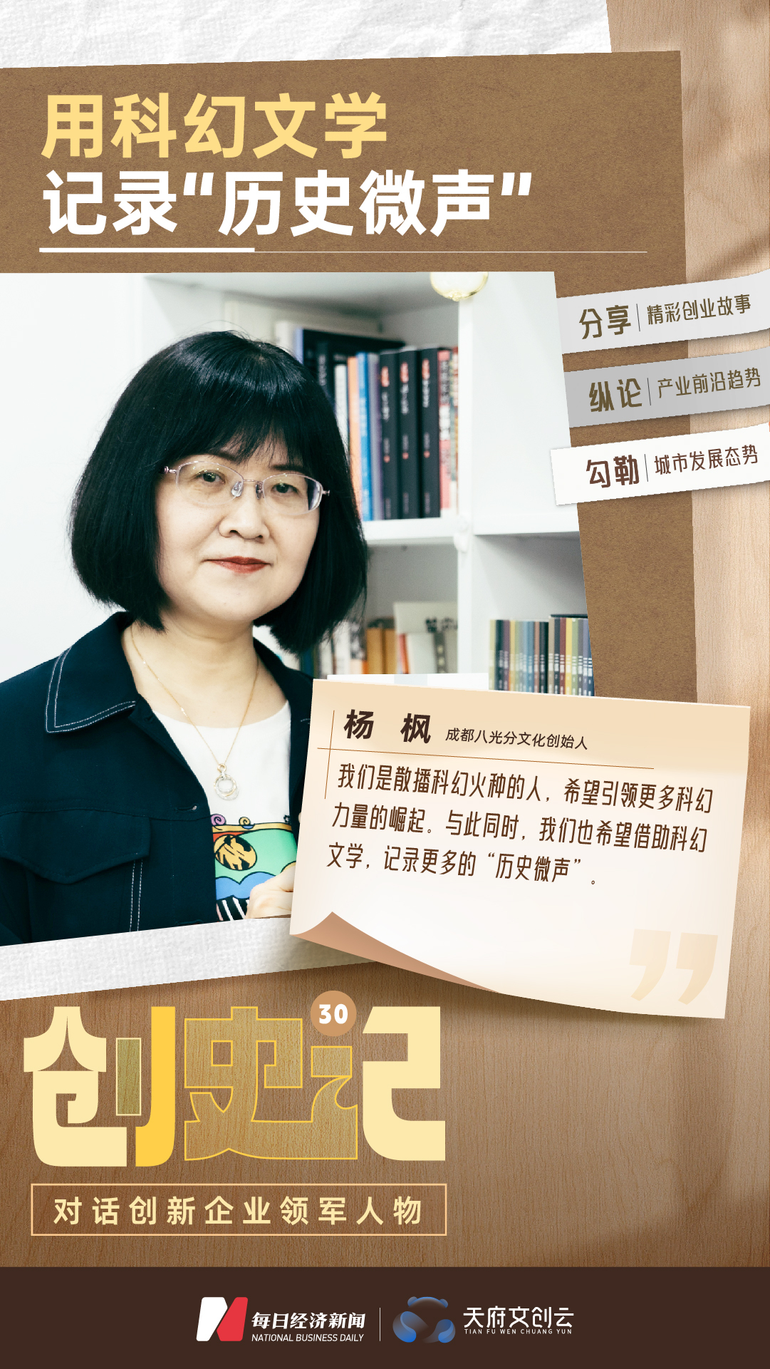 杨枫作为文学编辑、出版人及创业者,持续推动中国科幻文学发展。她创立的八光分文化,以科幻文学为切口,拓展至出版、影视、动漫、文旅等领域。她希望,自己作为散播科幻火种的人,能够引领更多科幻力量的崛起,也希望借助科幻文学,记录更多的“历史微声”。