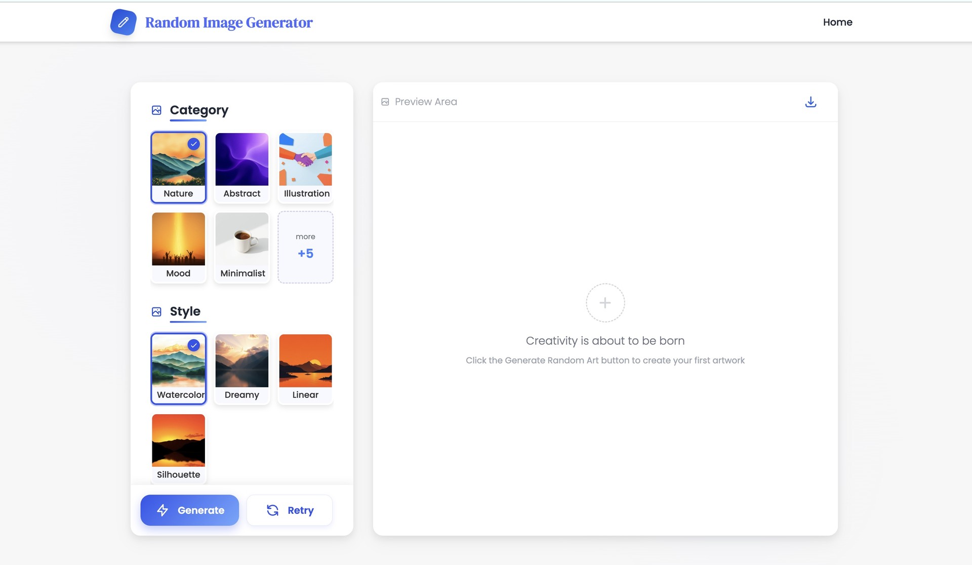 于是利用业余时间,我慢慢琢磨出了这款工具。它真的很简单:你想画风景就选风景,喜欢抽象就选抽象,然后输个关键词或直接用模板,系统就能给你生成独特的作品。不满意就重来,满意了就下载。