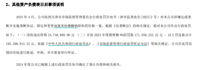 根据年报披露的信息,2025年4月,仙琚制药收到天津市市场监督管理委员会行政处罚告知书(津市监垄处告[2025]2号)对公司涉嫌达成垄断并实施垄断协议,固定和变更地塞米松磷酸钠原料药价格一案,根据反垄断法的相关规定,拟对公司作出行政处罚如下:(一)没收违法所得2375万元;(二)并处2023年度销售额8%的罚款1.72亿元,以上罚没款合计1.95亿元。