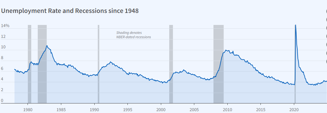 《每日经济新闻》记者注意到,根据美国国家经济研究局(NBER)的数据,1948年至今美国的每次衰退(下图灰色区域),都伴随着美国失业率(下图蓝色曲线)的显著上升,尤其是上一次由新冠疫情导致的短期衰退中,美国的失业率创下有记录以来的最高值(超过14%)。当时,美联储在两周内两次宣布紧急降低联邦基金利率,把利率区间降至0%至0.25%。美国在一夜之间进入“零利率时代”。后来,美联储甚至启动了无限量的量化宽松(QE)政策,向市场注入流动性。