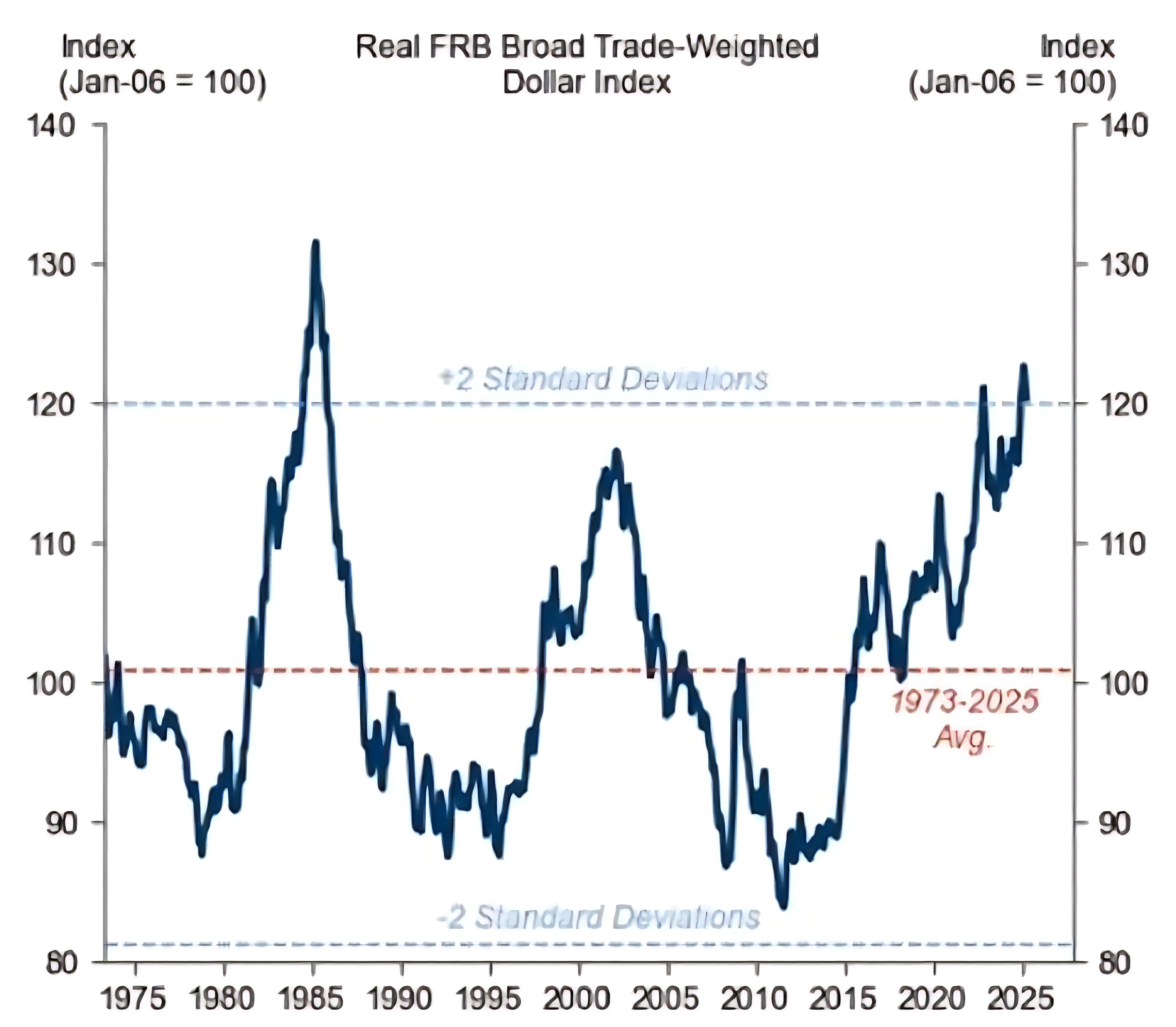 Hatzius指出,“自1973年浮动汇率时代开始以来,美元的实际价值仍比其平均水平高出近两个标准差。历史上仅有的两个估值水平相似的时期是上世纪80年代中期和本世纪初。这为美元贬值25%至30%奠定了基础。IMF估计,非美国投资者目前持有22万亿美元的美国资产。如果他们减少美国敞口,几乎可以肯定的是,美元将大幅贬值。而且,他们不愿增持美国资产的态度,也可能会对美元构成压力。”