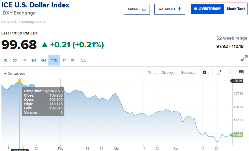自特朗普1月20日重返白宫至4月28日(周一)亚洲交易时段,美元指数已累计下跌近9%,可能创下1973年以来美国总统任期前百天内最差纪录。