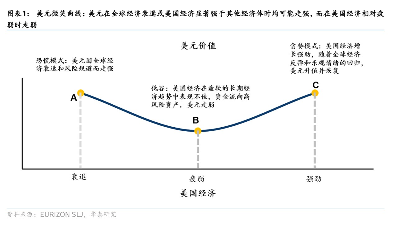 华泰研究援引经典的美元“微笑曲线”理论称,美元只有在美国经济弱于非美国家且没有衰退风险时才会出现走弱,2008年以来多数情况下均呈现易涨难跌的特征。不过,近期在不确定性上升的环境下美元指数持续下跌,避险属性明显弱化,美元微笑曲线“左侧失效”的风险明显上升,背后可能包含了长期与短期的多重因素。