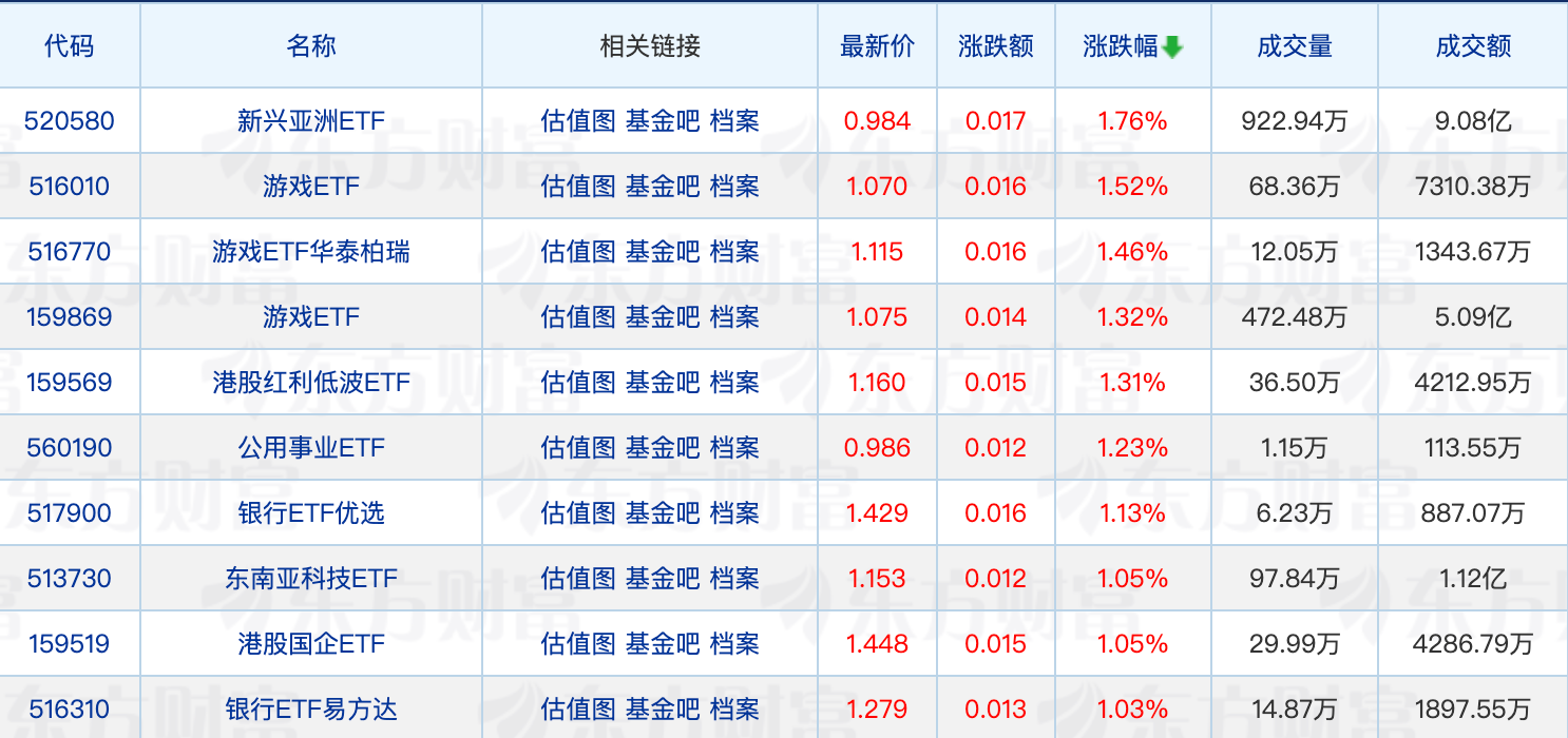 具体来看,游戏ETF上涨居前,最高上涨1.52% 。