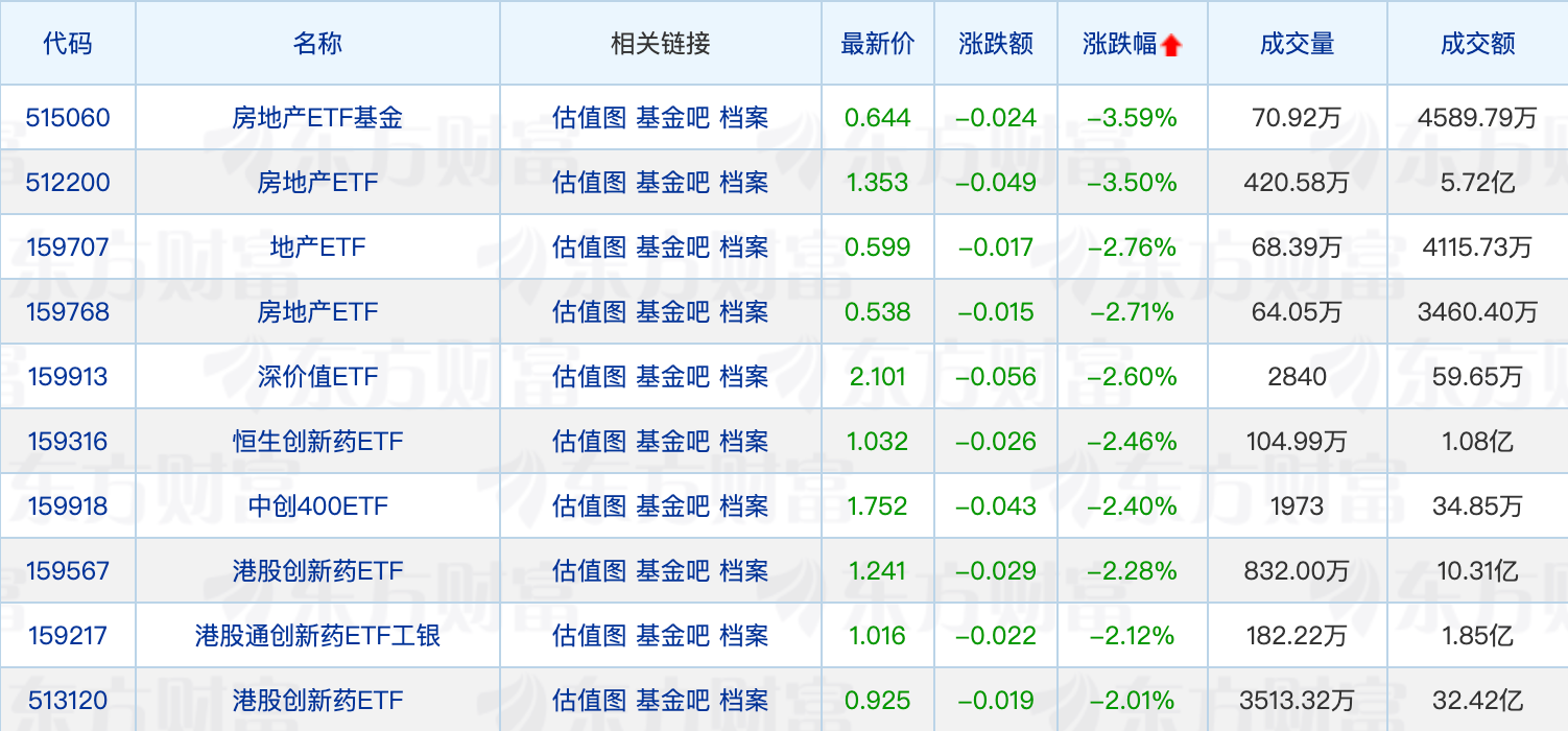 下跌方面,地产股集体大跌,渝开发等多股跌停,地产ETF回调领跌3.59%。