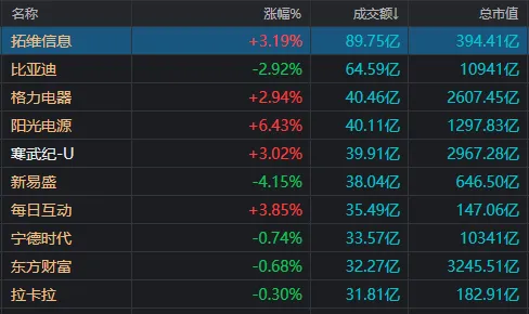 科技股中,市值约3000亿元的寒武纪(688256),股价重回700元上方,成交额居全市场第4。上周五涨停的拓维信息(002261)今日继续上攻,成交额连续两天全市场居首。