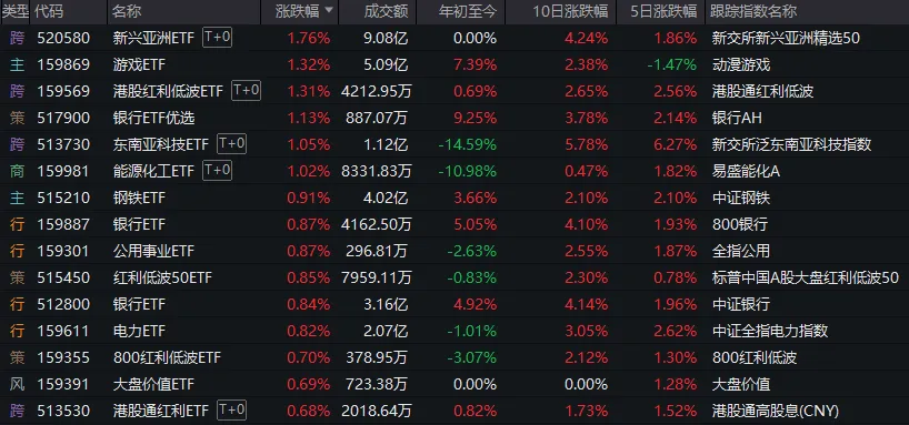 上文提到的工商银行、长江电力,分别是银行ETF和电力ETF(以及绿色电力ETF)的权重成分股,因此相关产品今天也在场内ETF中表现居前。