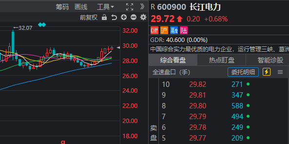 电力板块的长江电力(600900),盘中最高涨至29.92元,创近期新高,也是去年10月8日以来最接近30元关口的一次(下图为周K线)。