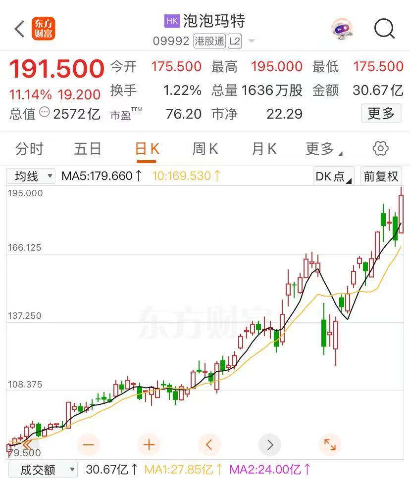 28日,港股泡泡玛特(HK09992,股价:191.5港元;总市值:2572亿港元)涨超11%,股价创历史新高。值得一提的是,泡泡玛特在2024年全年股价大涨346.66%,今年股价再涨100%。