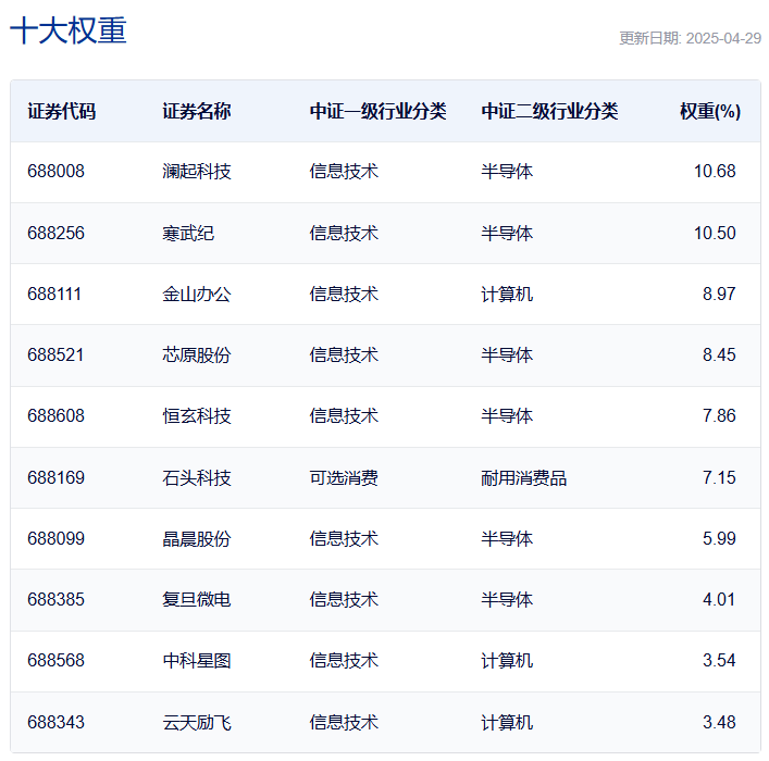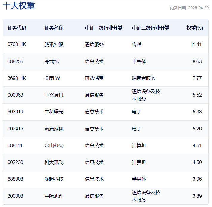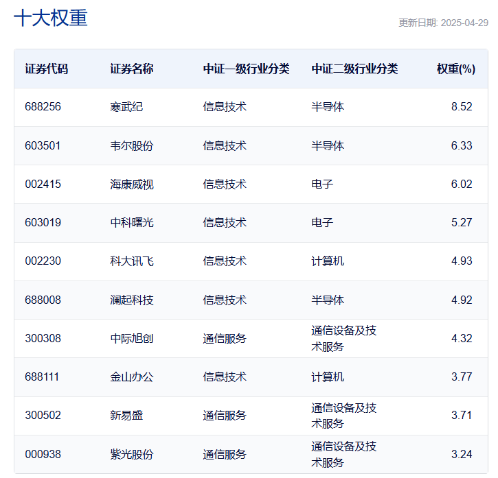 中证人工智能主题指数:前十大权重股包括寒武纪、韦尔股份、海康威视等,合计占比超过50%,涉及半导体和通信设备的股票数量较多。