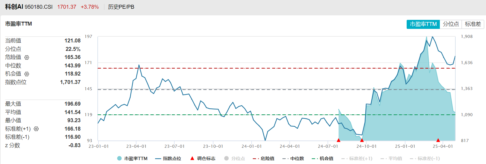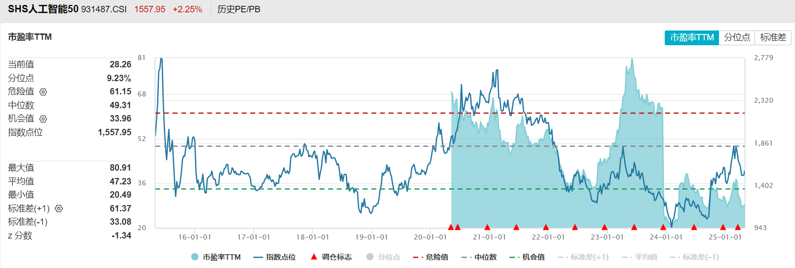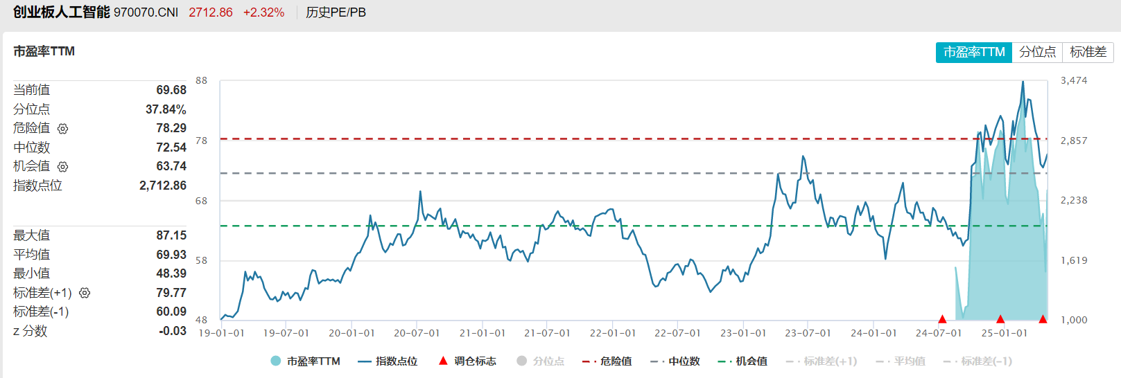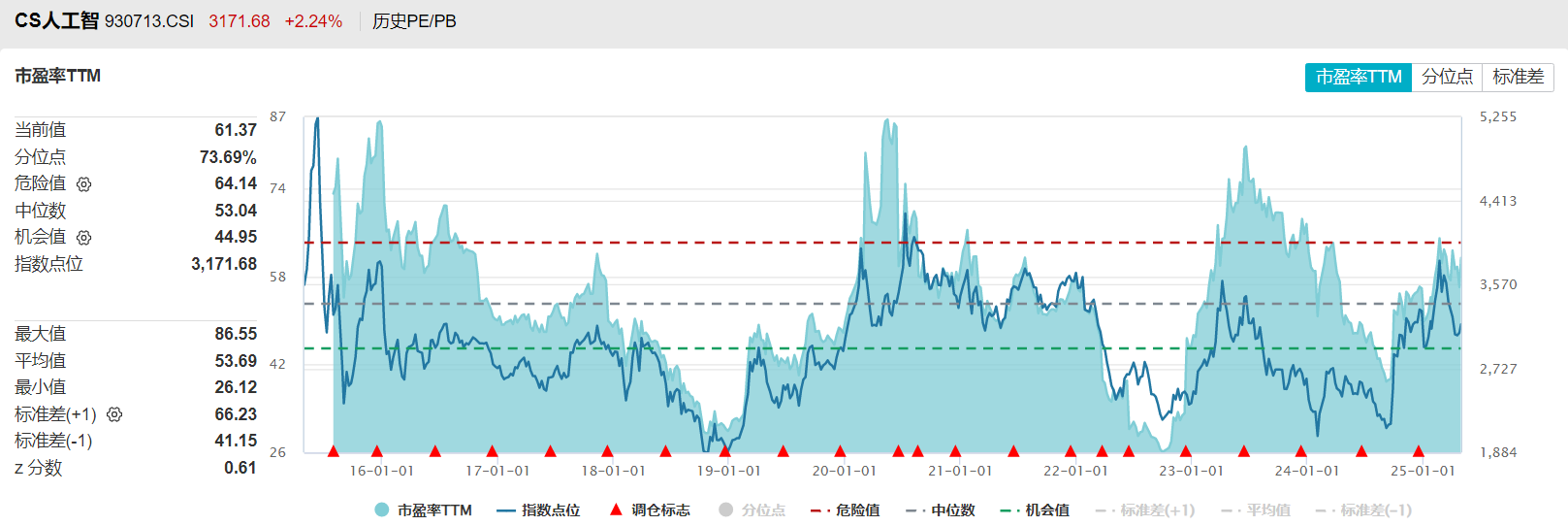 中证人工智能主题指数目前的市盈率TTM已经回升到了历史70%分位以上,属于较高位置。