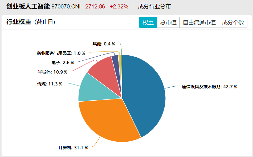 创业板人工智能指数:侧重于通信设备及信息技术服务,占比超过40%,在AI硬件、软件、应用上覆盖较均衡。