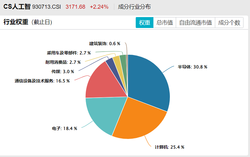 中证人工智能主题指数:按照中证二级行业划分,主要集中在半导体、计算机、电子等领域。