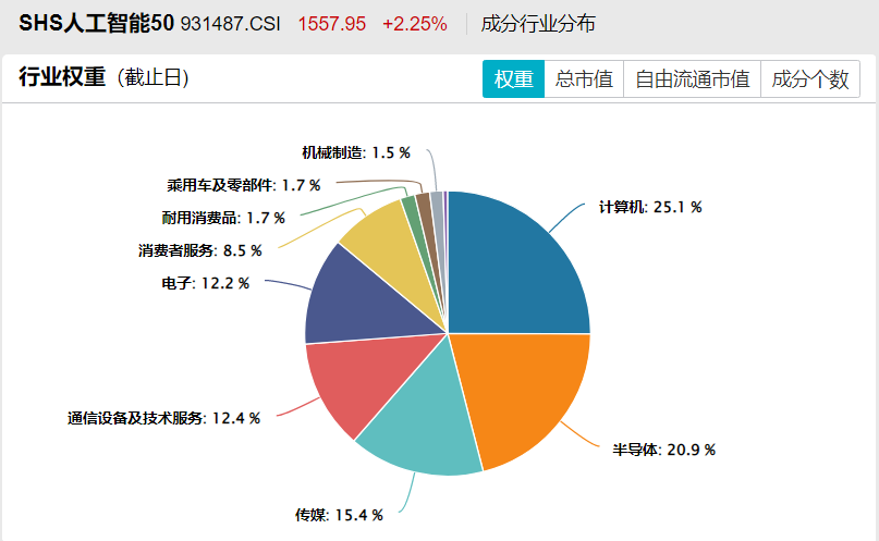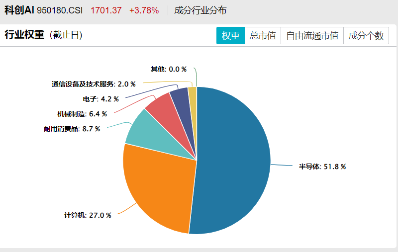 上证科创板人工智能指数:重点关注半导体行业,半导体行业权重超过50%,还涉及计算机、耐用消费品、机械制造、电子等行业。